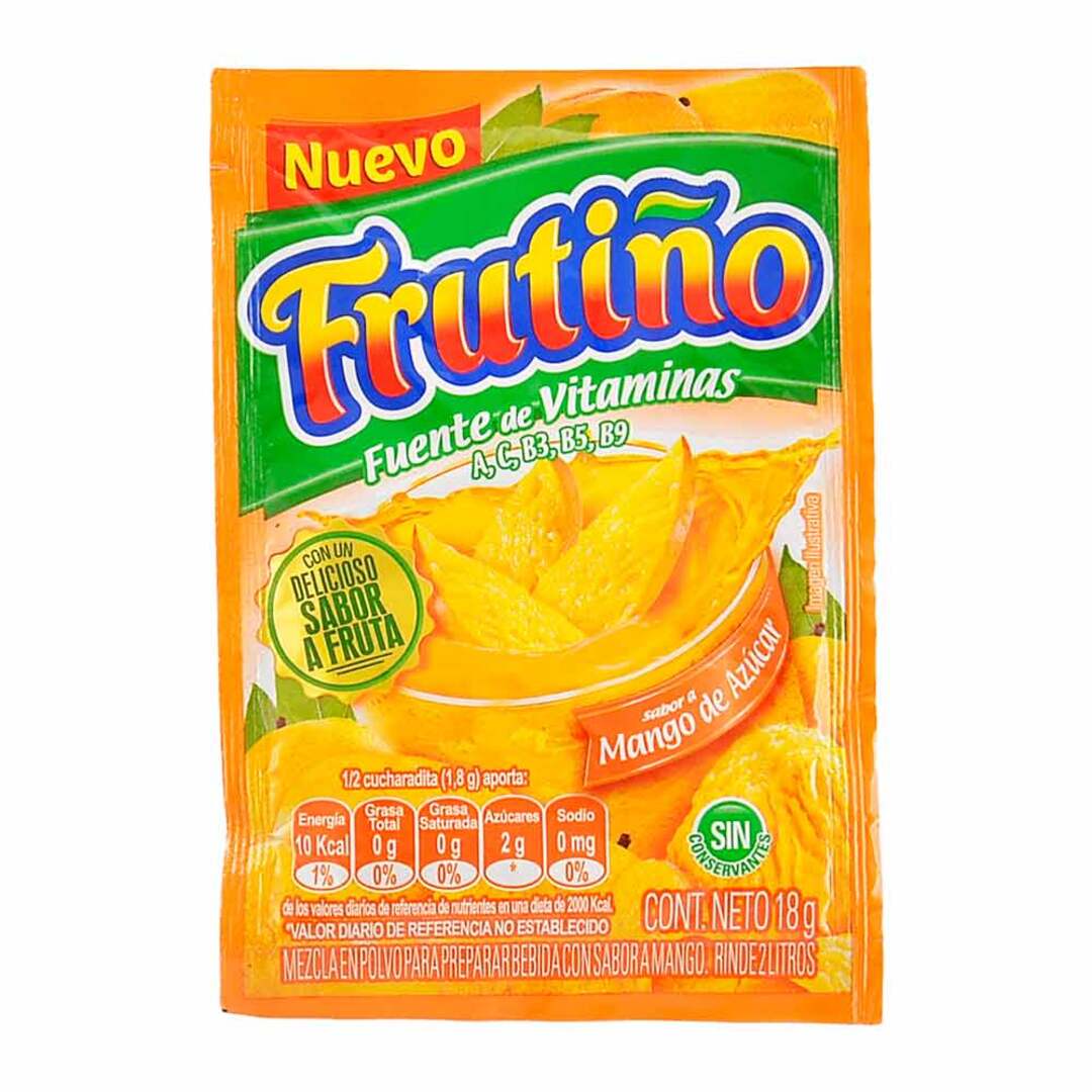 Bebida en polvo con sabor artificial a mango con vitaminas A, C, B3, B5, B9.